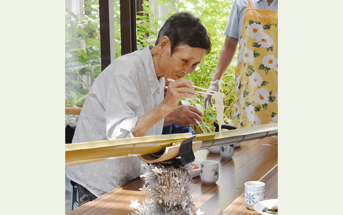 皆さん、勢いよく流れてくる“そうめん”をナイスキャッチして、つゆにつけて食しました。「みんなで一緒に楽しく食事をすることは、本当においしい」という声が聴かれました。