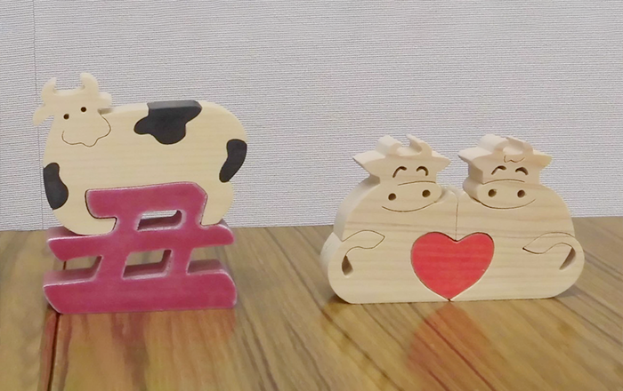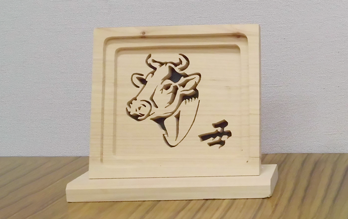 山口県立萩商工高等学校の電気・建築科の工業研究部の生徒と建築コース教員の皆さんで作成した2021年干支「丑」の木工作品が、当苑に寄贈されました。